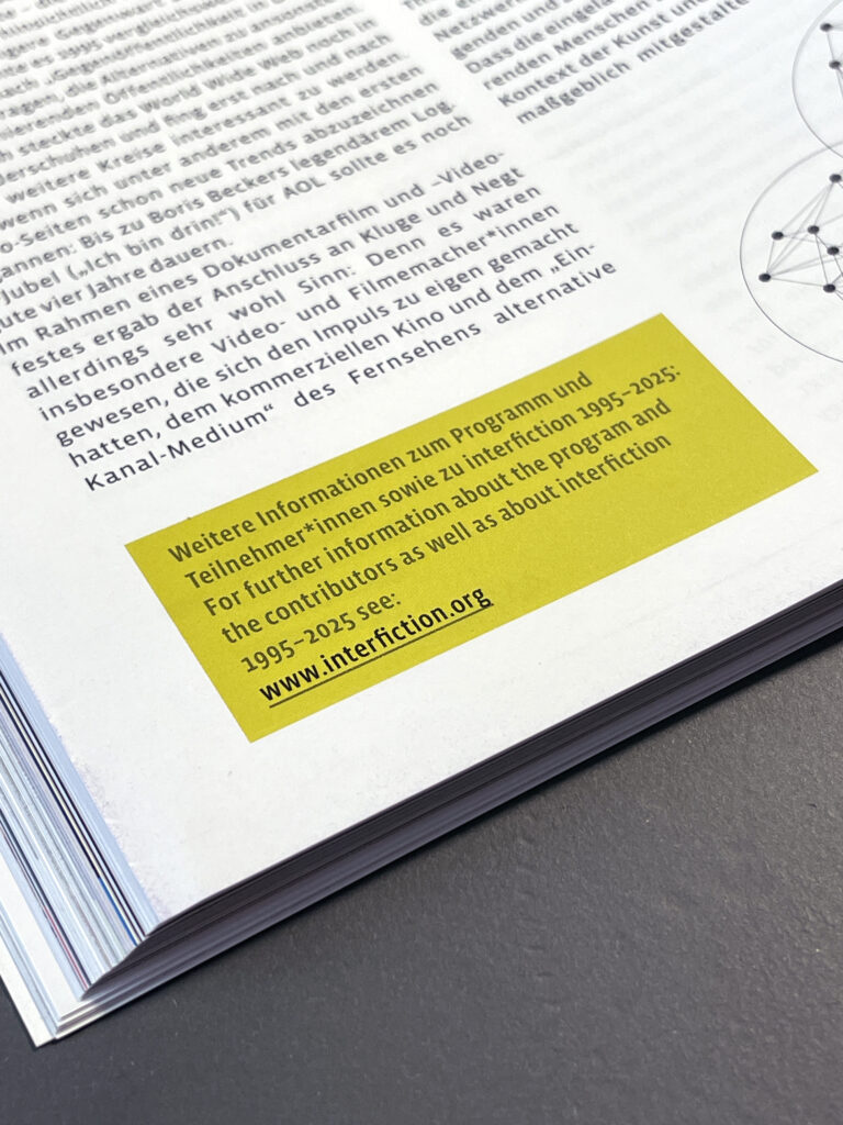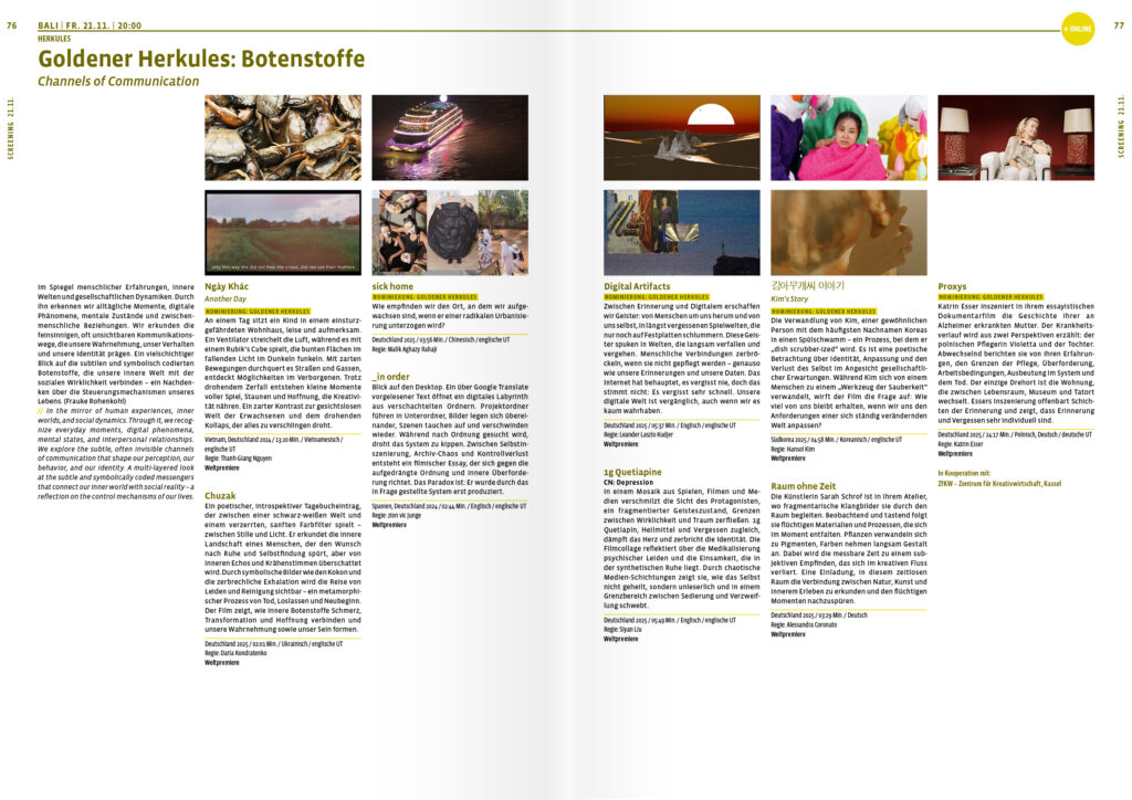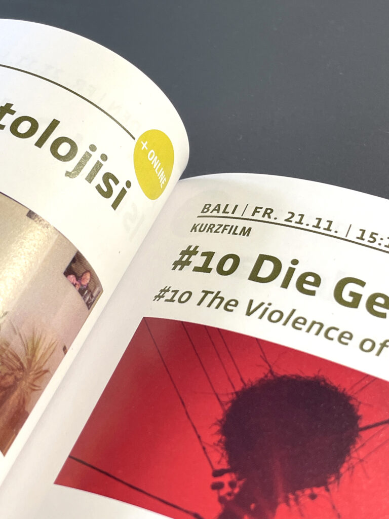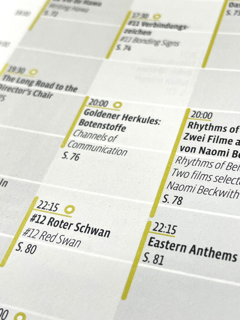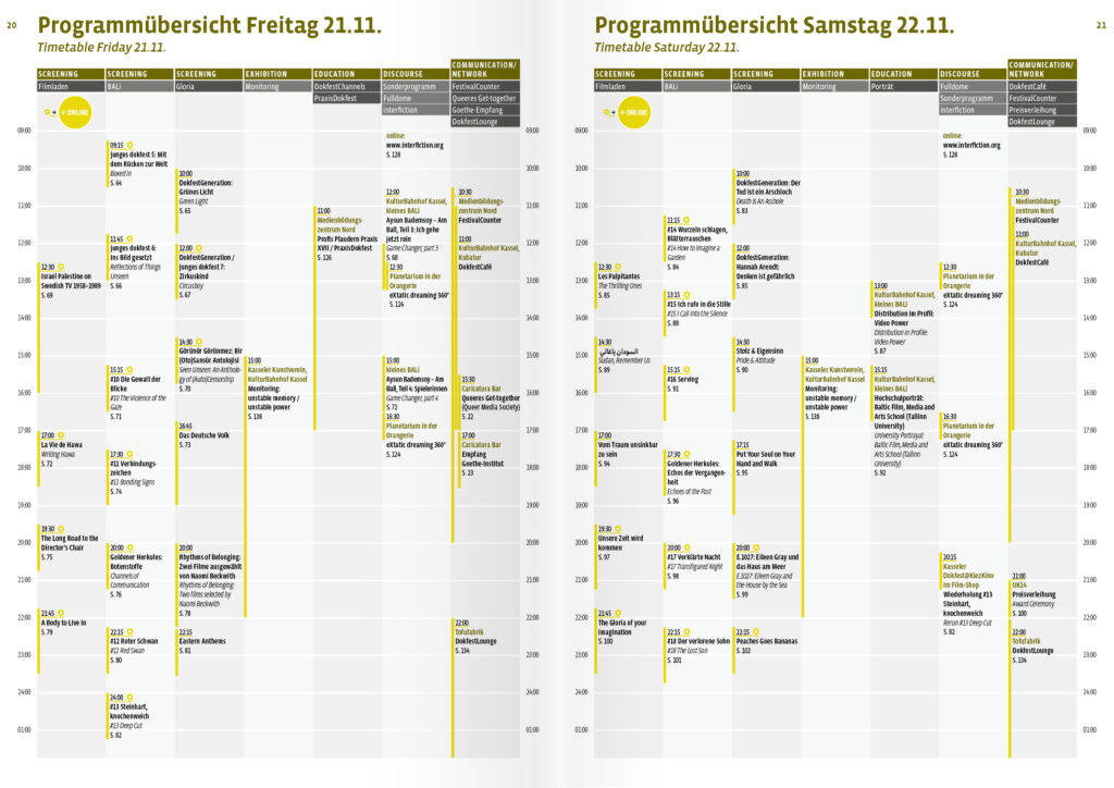 Grafische Betreuung des 42. Kasseler Dokumentarfilm- und Videofests, von der Mitwirkung an der Erstellung des Keyvisuals über die Definition des jährlichen Corporate Designs bis zur Gestaltung diverser Anwendungen wie 164-seitiger Programmkatalog, Anzeigen, Ausschreibung, Aussenbannern, Briefkopf, Counterschildern, Dauerkarten, Kinoprojektionen für Eröffnung und Preisverleihung, Digitalscreens, DokfestGeneration Folder, junges dokfest – Logo + Flyer, Postkarten, Laurels, Plakate, Rednerpult, Urkunden, Socialmedia.